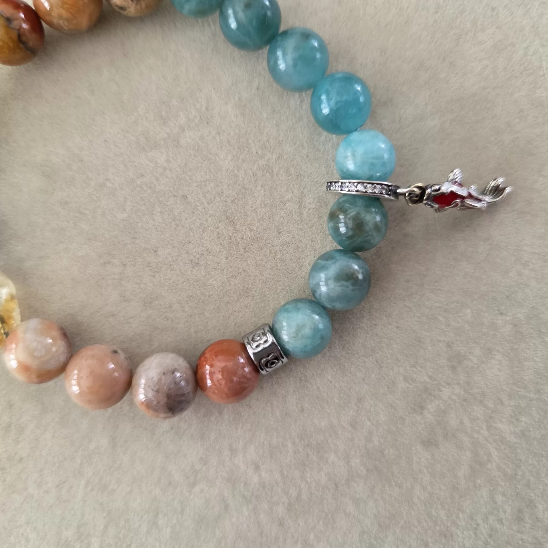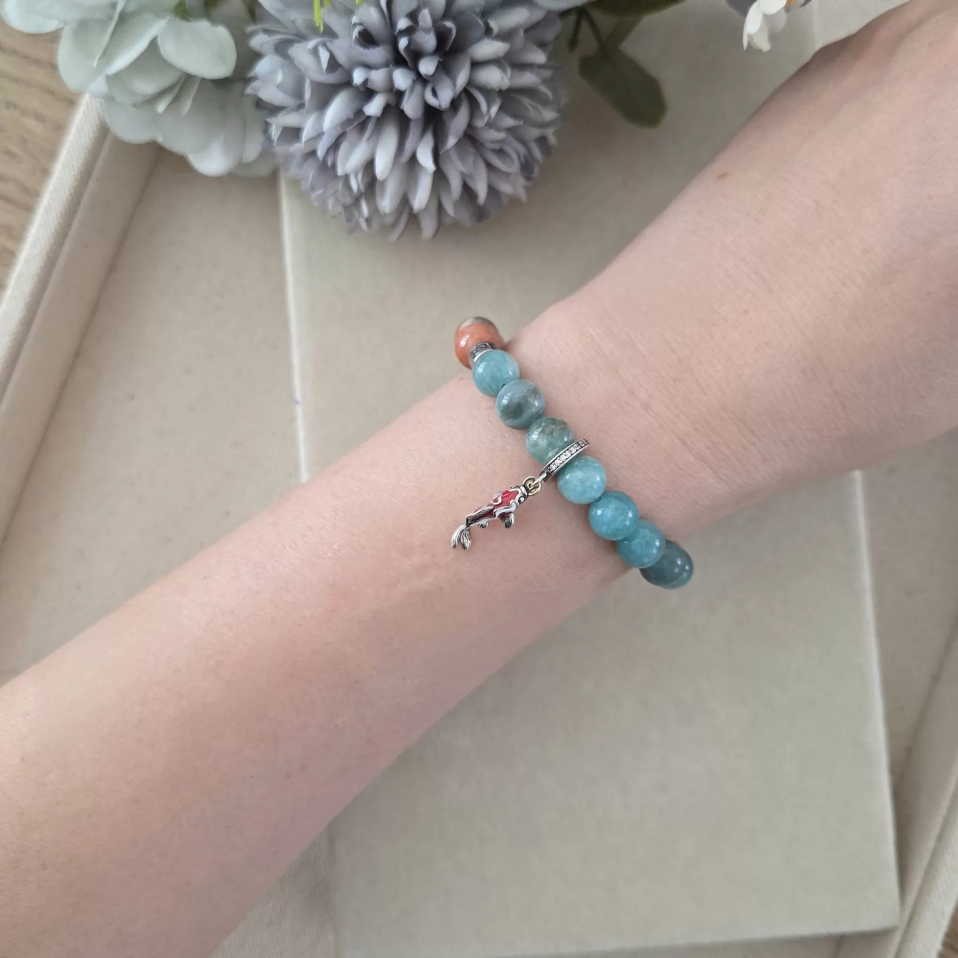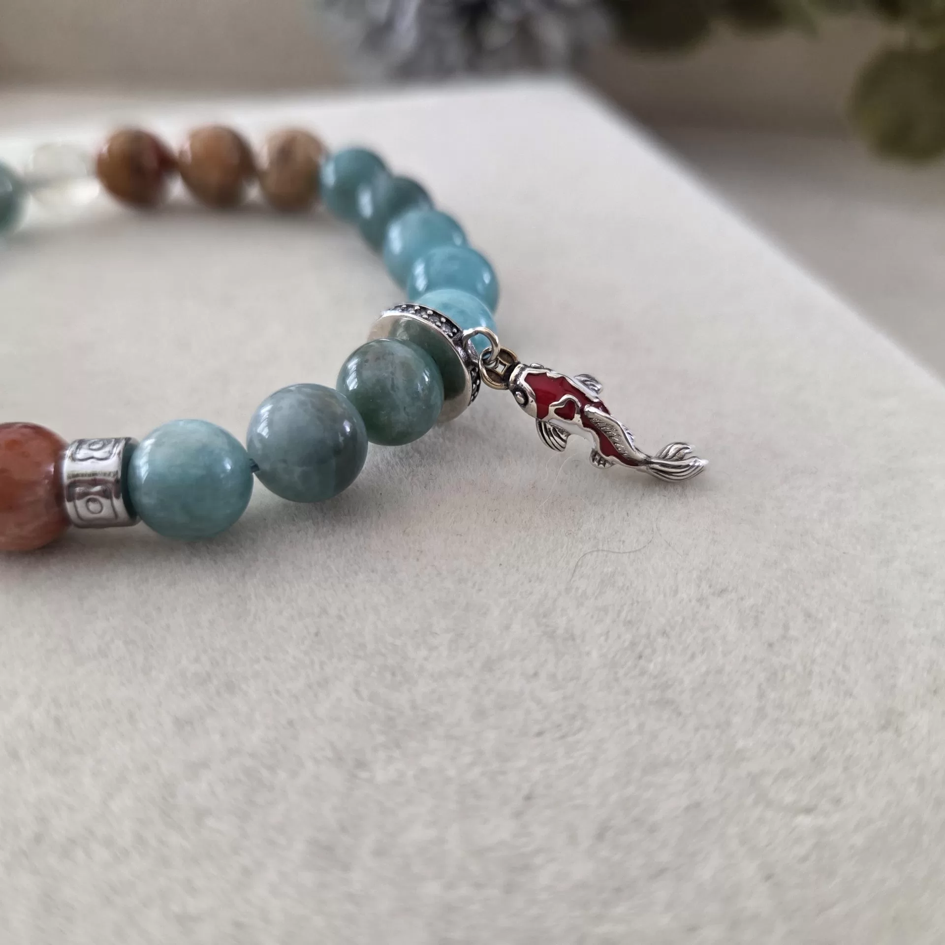 This serene bracelet brings together the calming blue-green of amazonite, the warm grounding of coral jade, and a single rabbit hair spacer for a touch of earthy softness. At its heart swims a graceful koi fish charm, symbolizing perseverance, abundance, and the quiet strength to move forward—no matter the current.