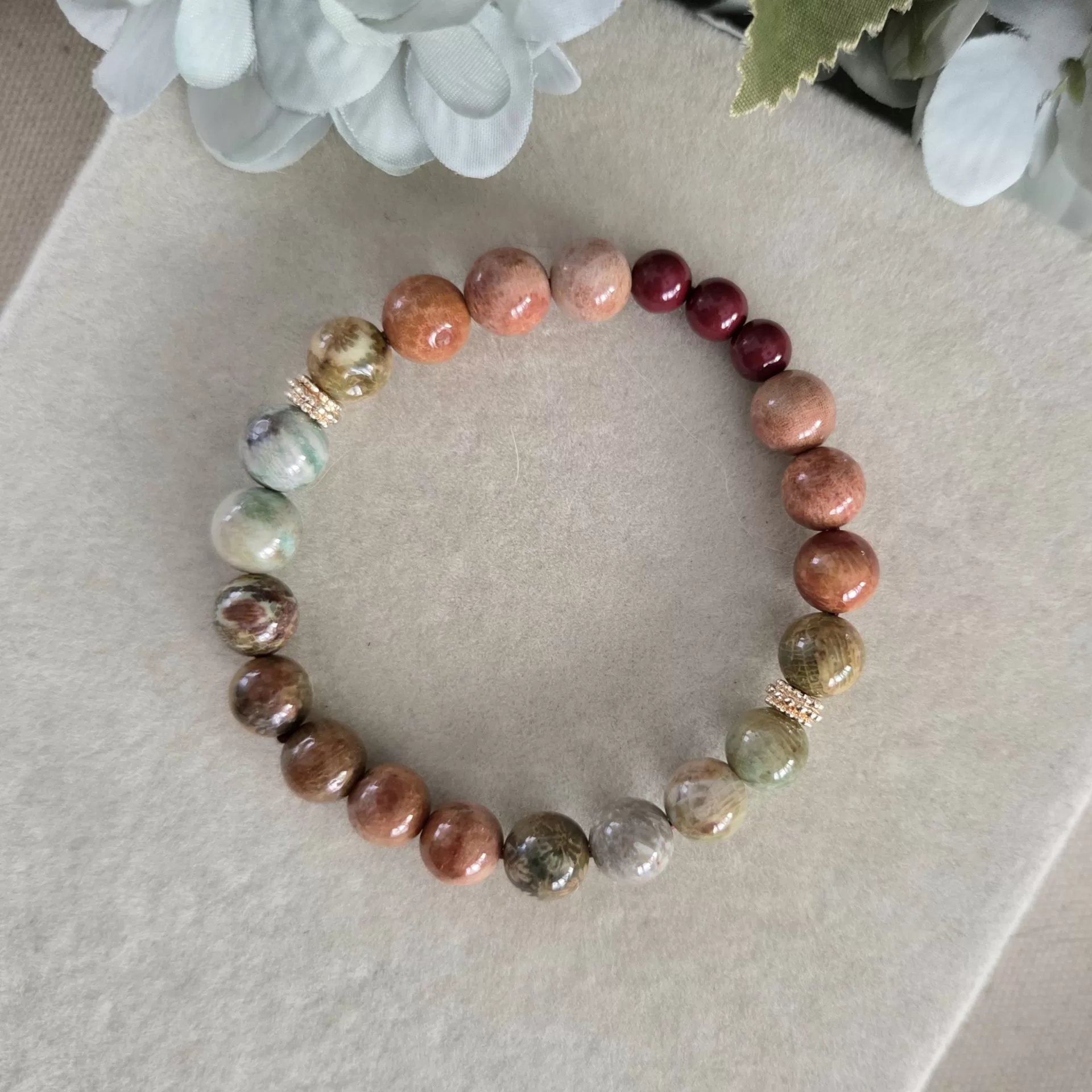 Coral jade brings emotional balance and steady confidence, while its multicolored tones symbolize adaptability and inner harmony. It’s also traditionally associated with physical vitality and overall wellness, believed to support the body’s natural healing rhythms. The cinnabar beads, rich in crimson red, are revered for their connection to life force energy, helping to boost stamina, align the chakras, and release energetic blockages. The golden rings add a touch of elegance and amplify the bracelet’s energy of abundance and success.