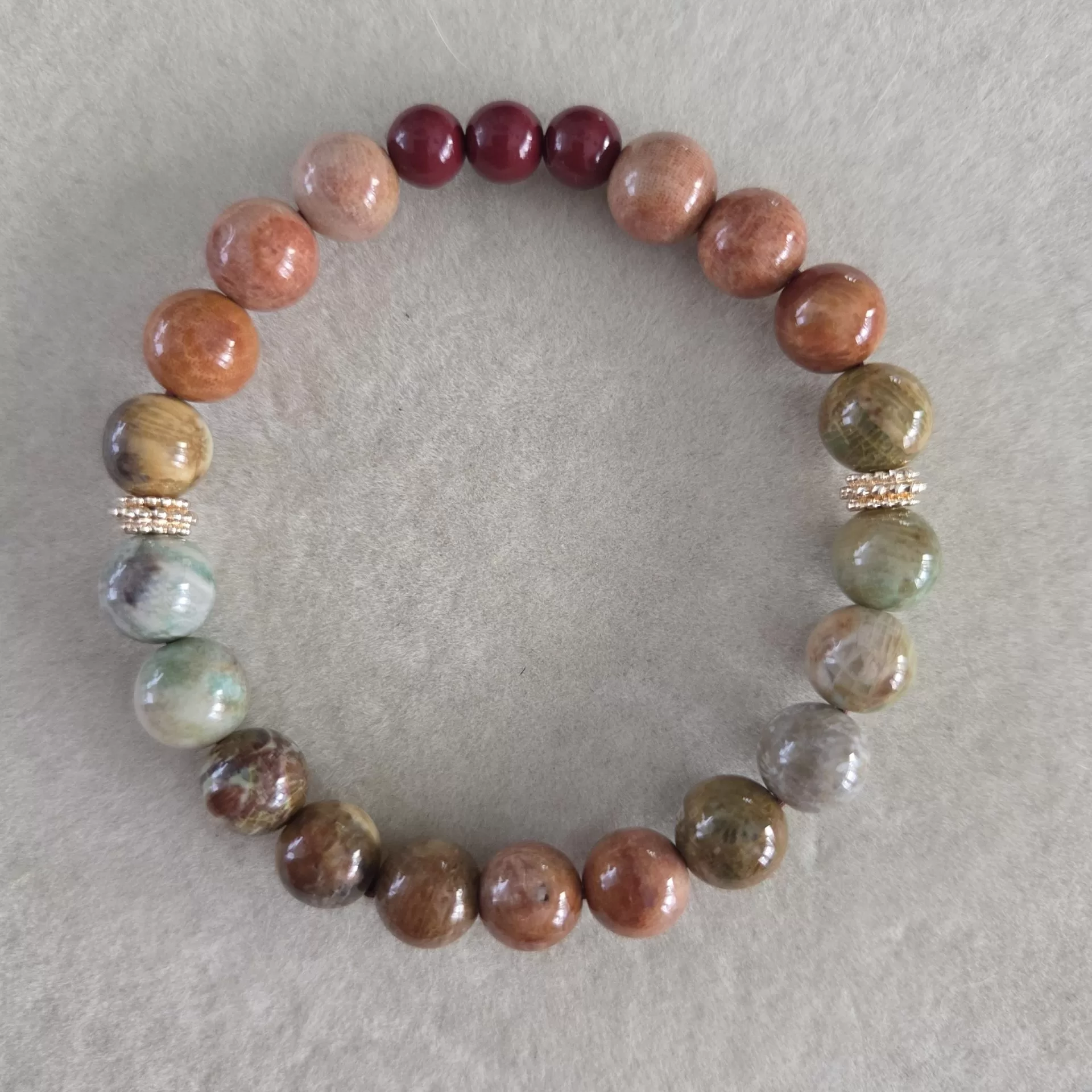 This radiant bracelet blends the grounding energy of blue, orange, and brown coral jade beads with the bold charm of three cinnabar accents and the refined shimmer of two golden spacer rings. Like a sunset reflected on tranquil waters, its palette evokes warmth, movement, and quiet strength.