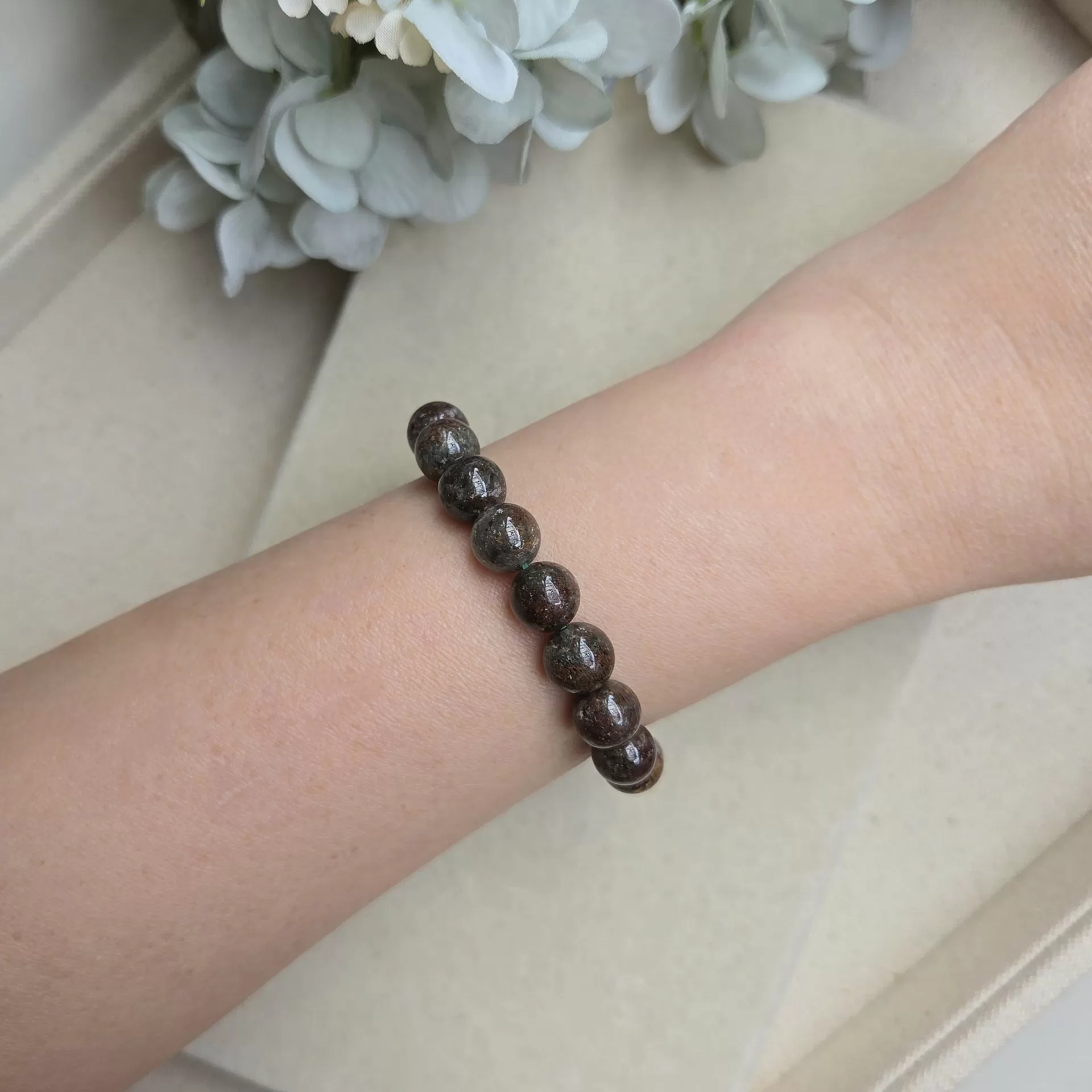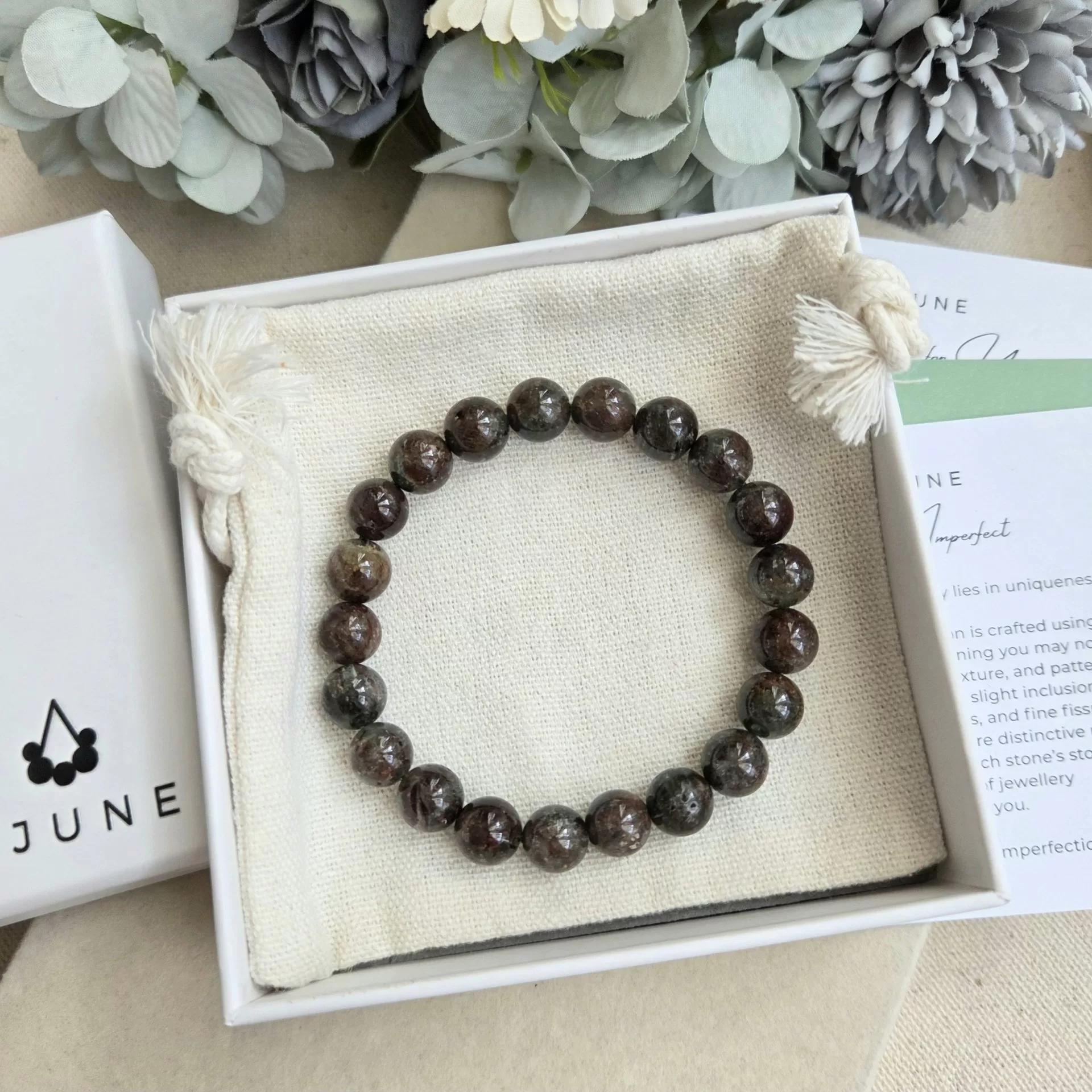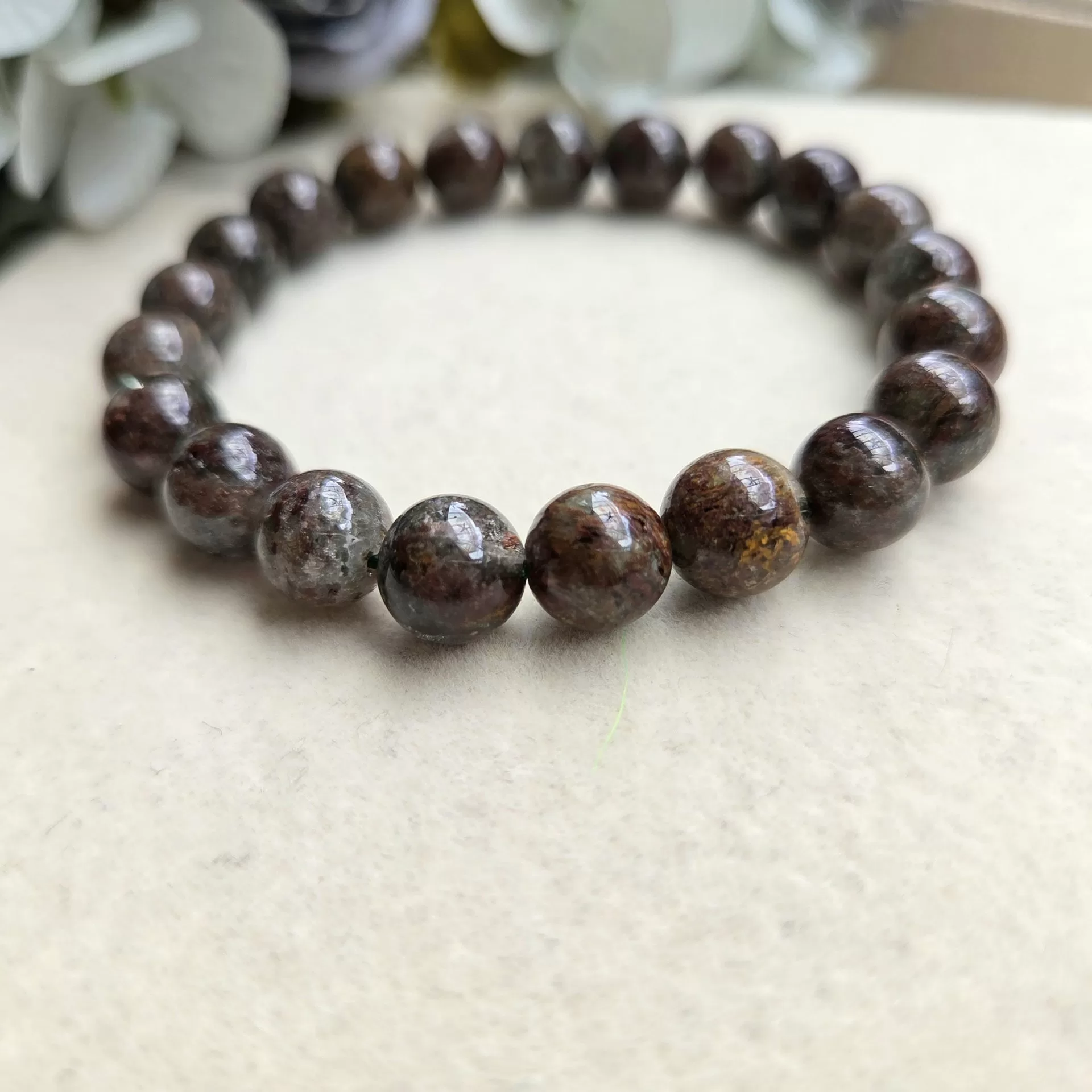 The natural density of inclusions gives each bead a visually bold, almost opaque character, while still allowing glimpses of clarity beneath. The result is a bracelet that feels grounded, substantial, and quietly powerful—perfect for those drawn to the raw beauty of nature’s process.
