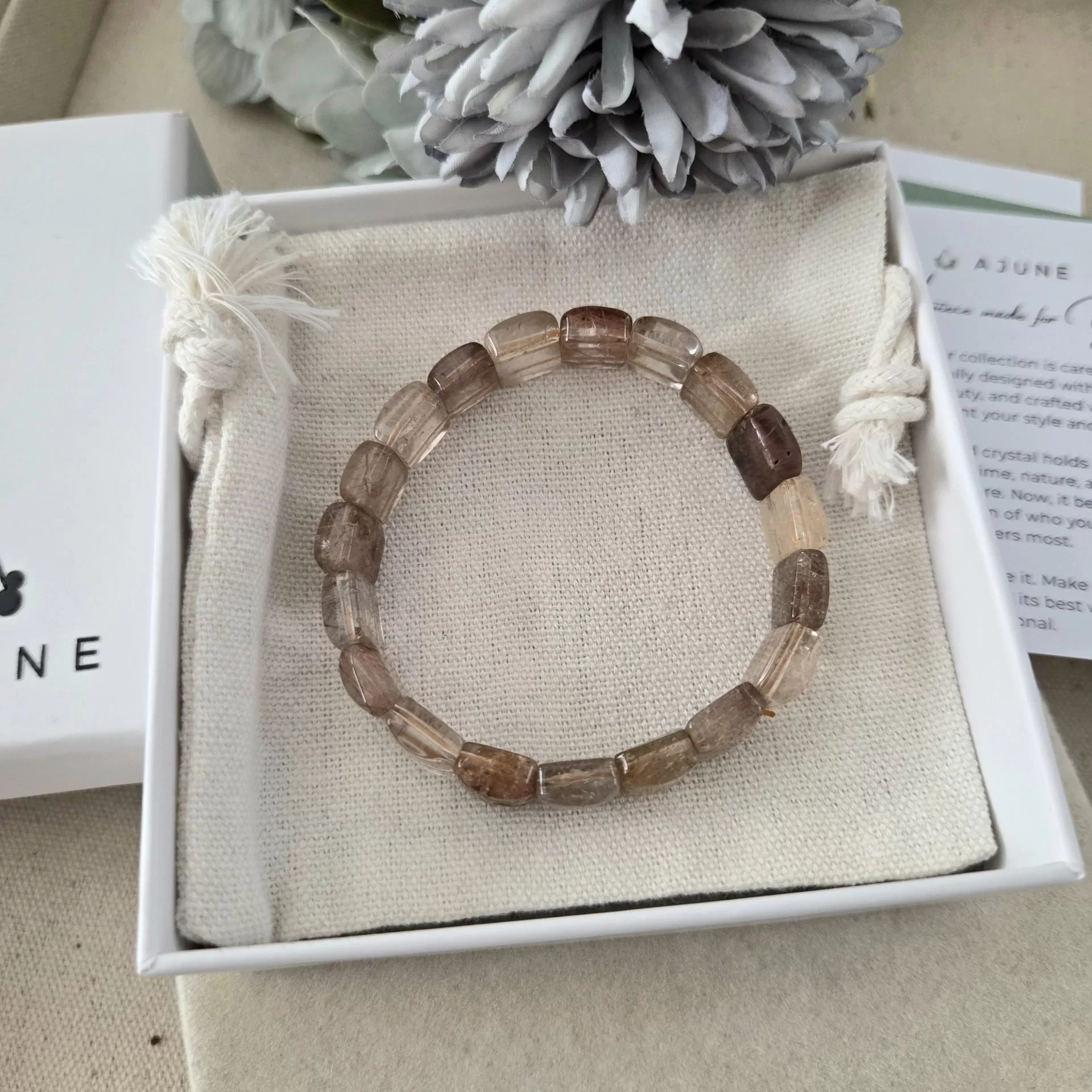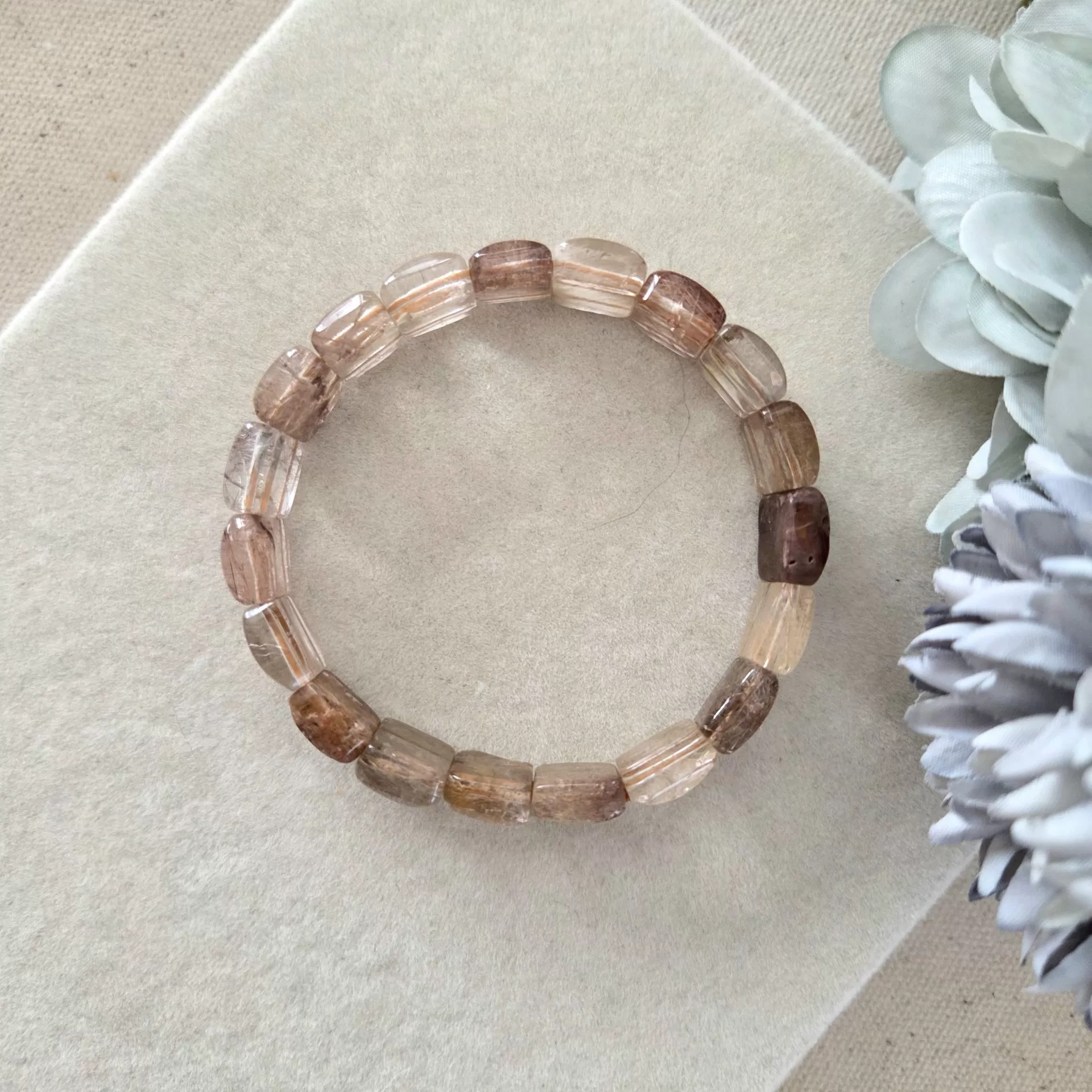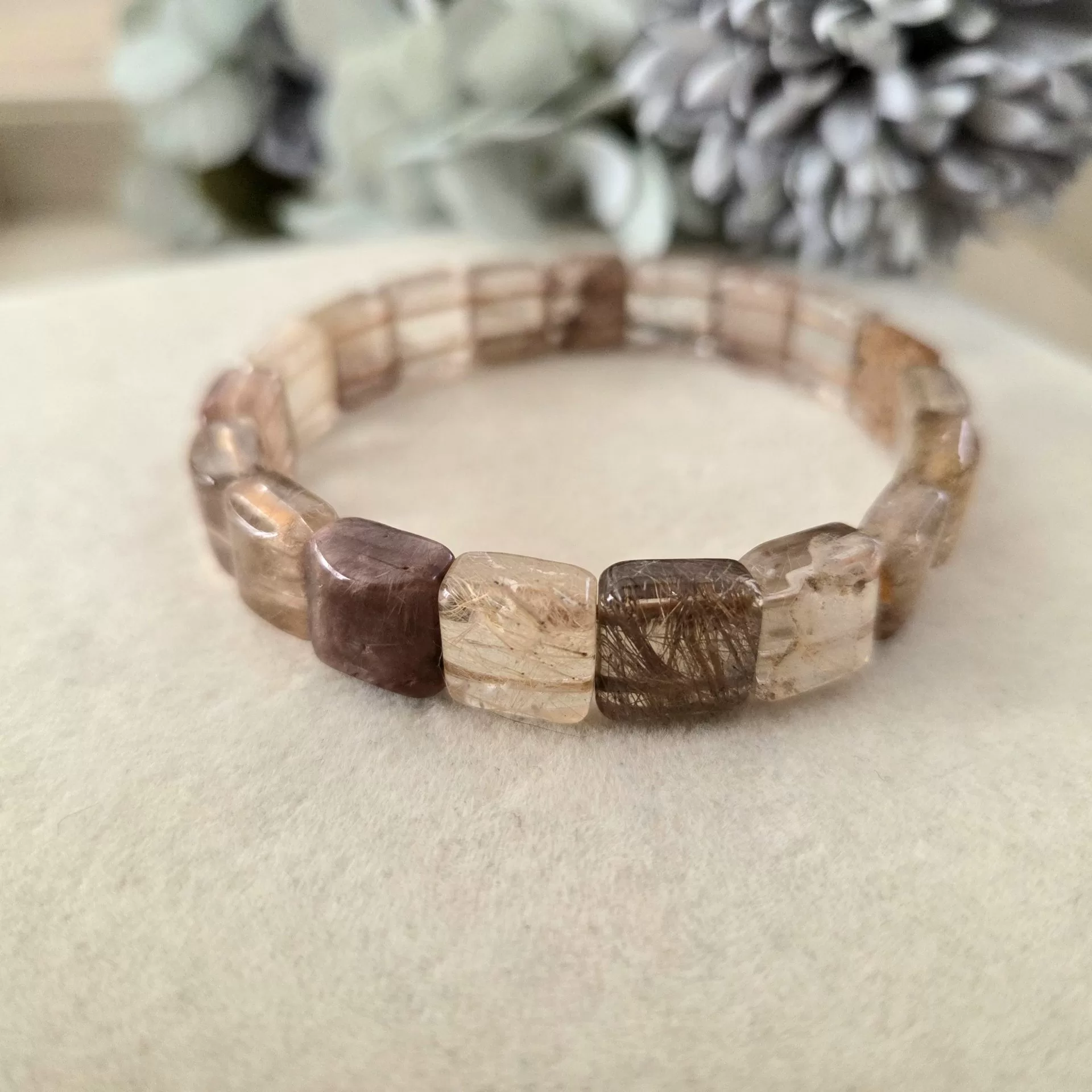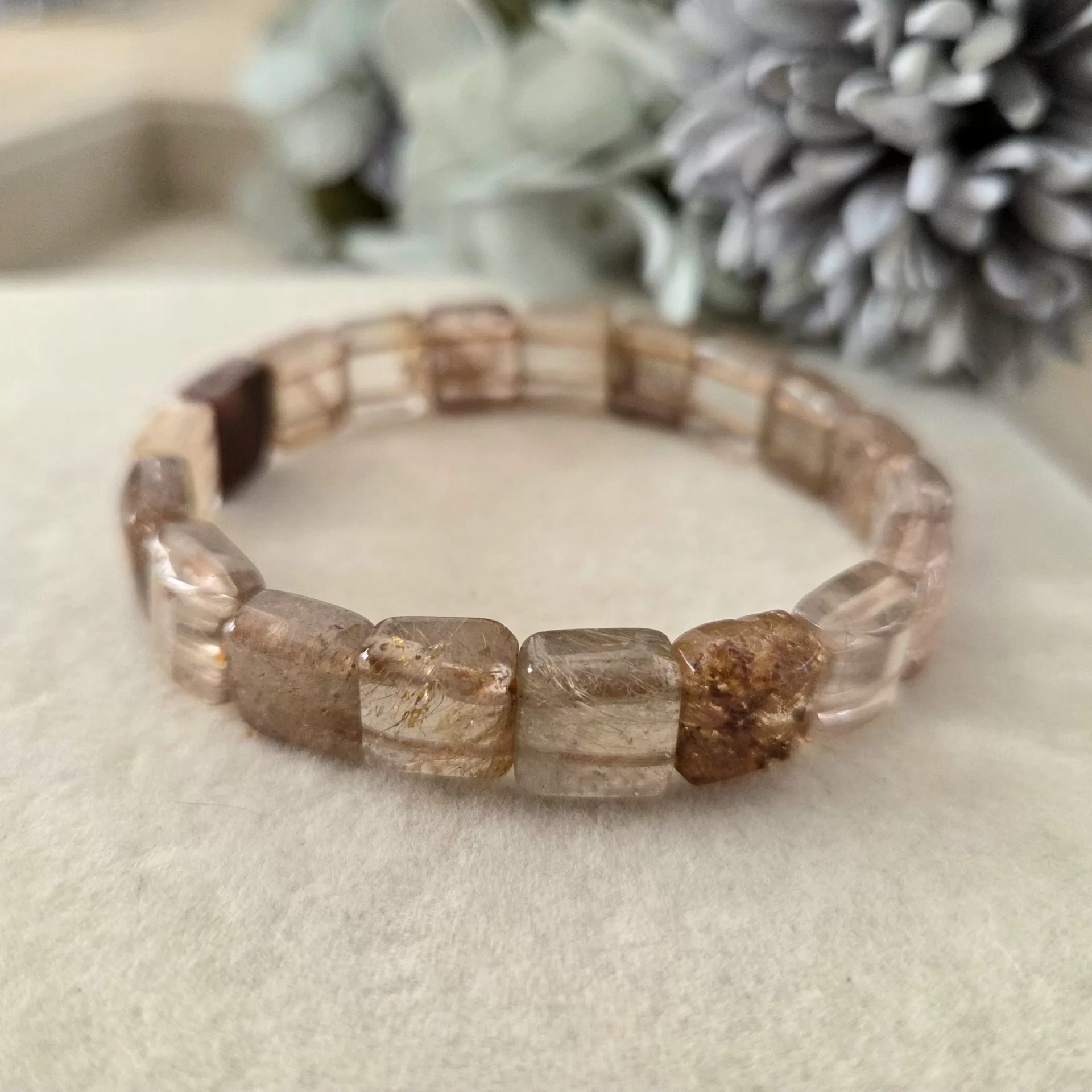 This elegant bracelet features 10mm square-cut beads of Titanium Rutile Quartz, showcasing delicate threads of gold and brown rutile suspended in clear quartz. The result is a soft, luminous design that feels both grounded and radiant—like sunlight filtering through autumn mist.